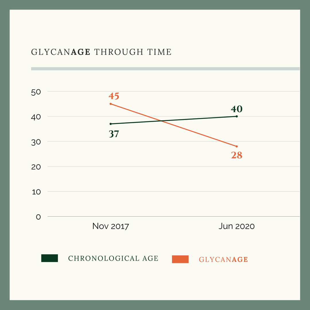我第一次接受检测时,我的糖蛋白年龄比实际年龄大7岁。当时我的饮食不太健康,坚果和高脂肉类的脂肪含量很高。我还经常禁食,但这并没有给我带来任何好处。